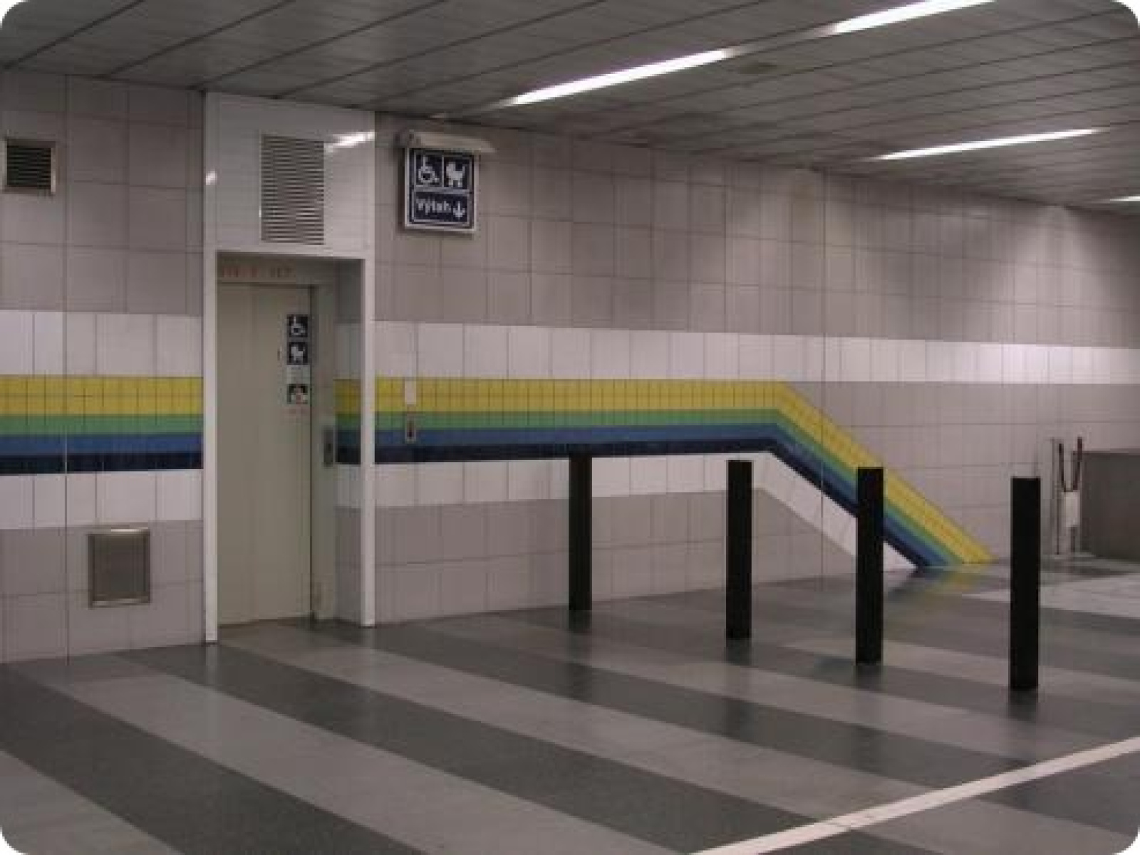 Výtah je na obou vstupech označen piktogramy a přístup k výtahu v podchodu v úrovni vestibulu a na nástupišti metra je znázorněn na informačních panelech.