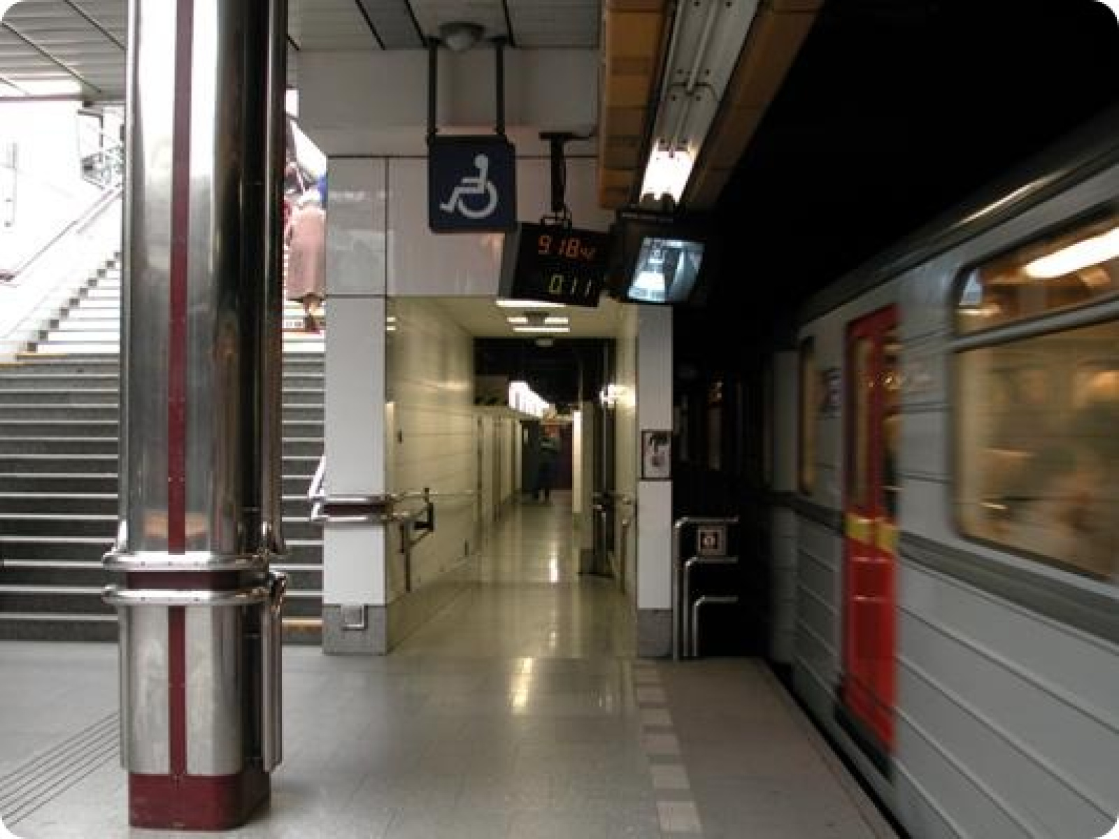 V prostorách nástupiště jsou zvýrazněny bezpečnostní pásy a ve stanici jsou vodící linie.