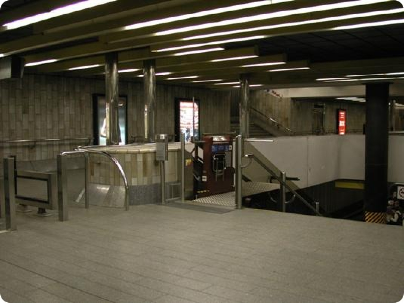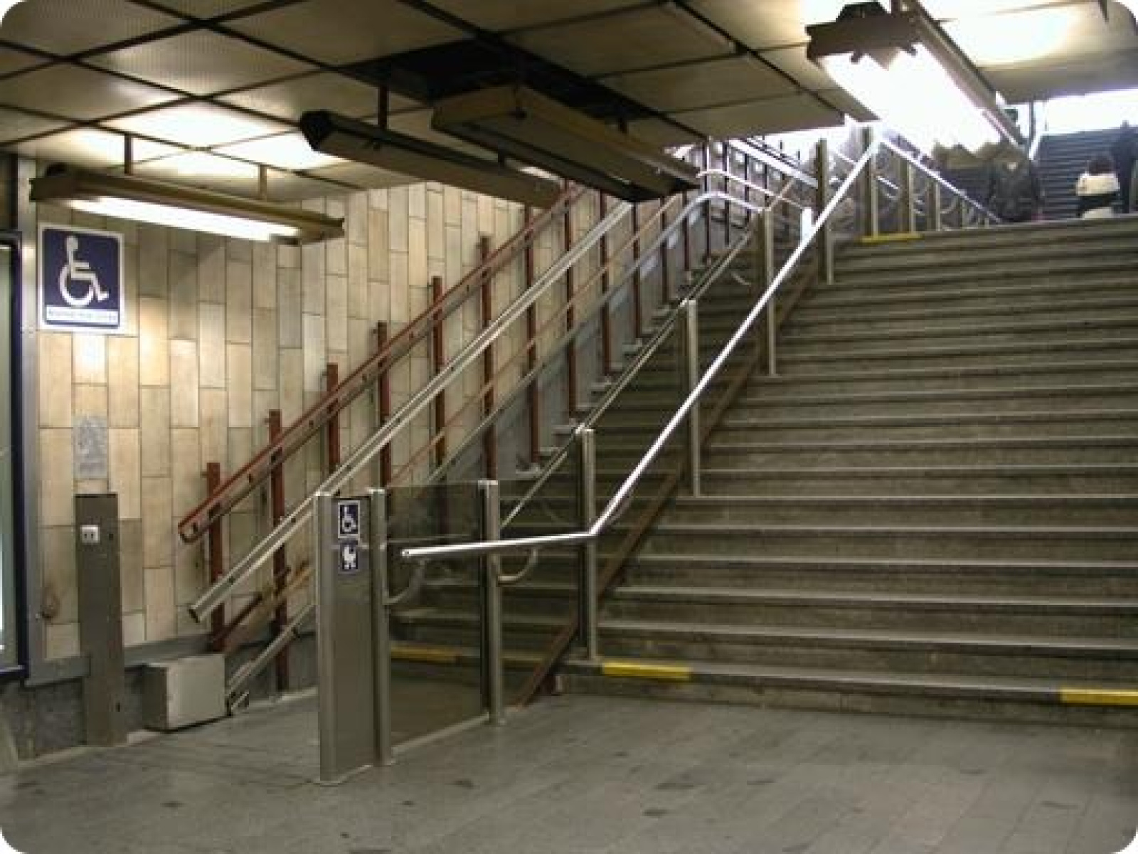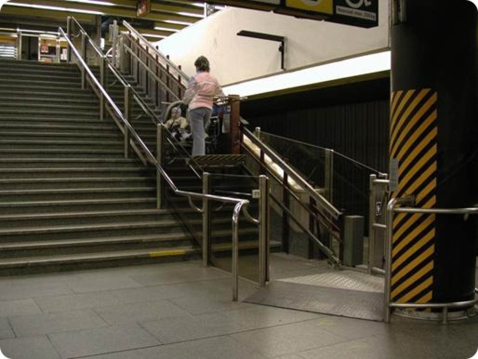 Dráha každé plošiny je oddělená skleněnou stěnou od pevného schodiště a nástupy jsou vybaveny optickými zábranami upozorňující hlasovým signálem na vstup do jízdní dráhy plošiny. Prostor plošiny je vybaven automatickou zábranou, zamezující její opuštění mimo prostor nástupů.