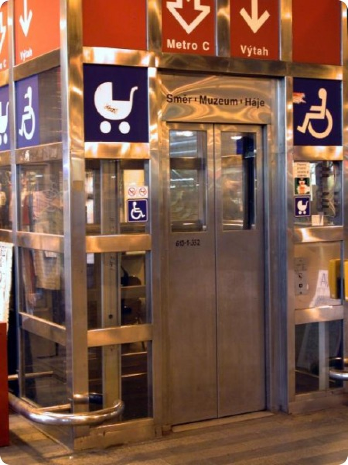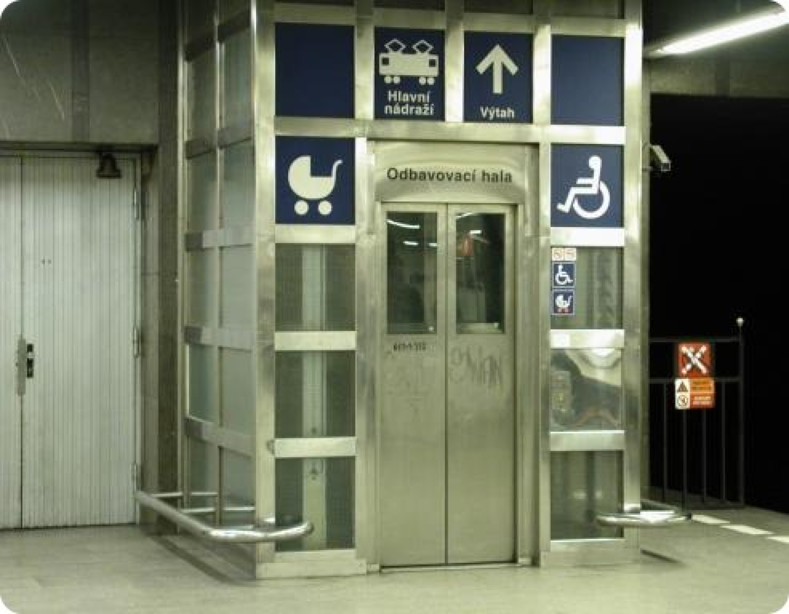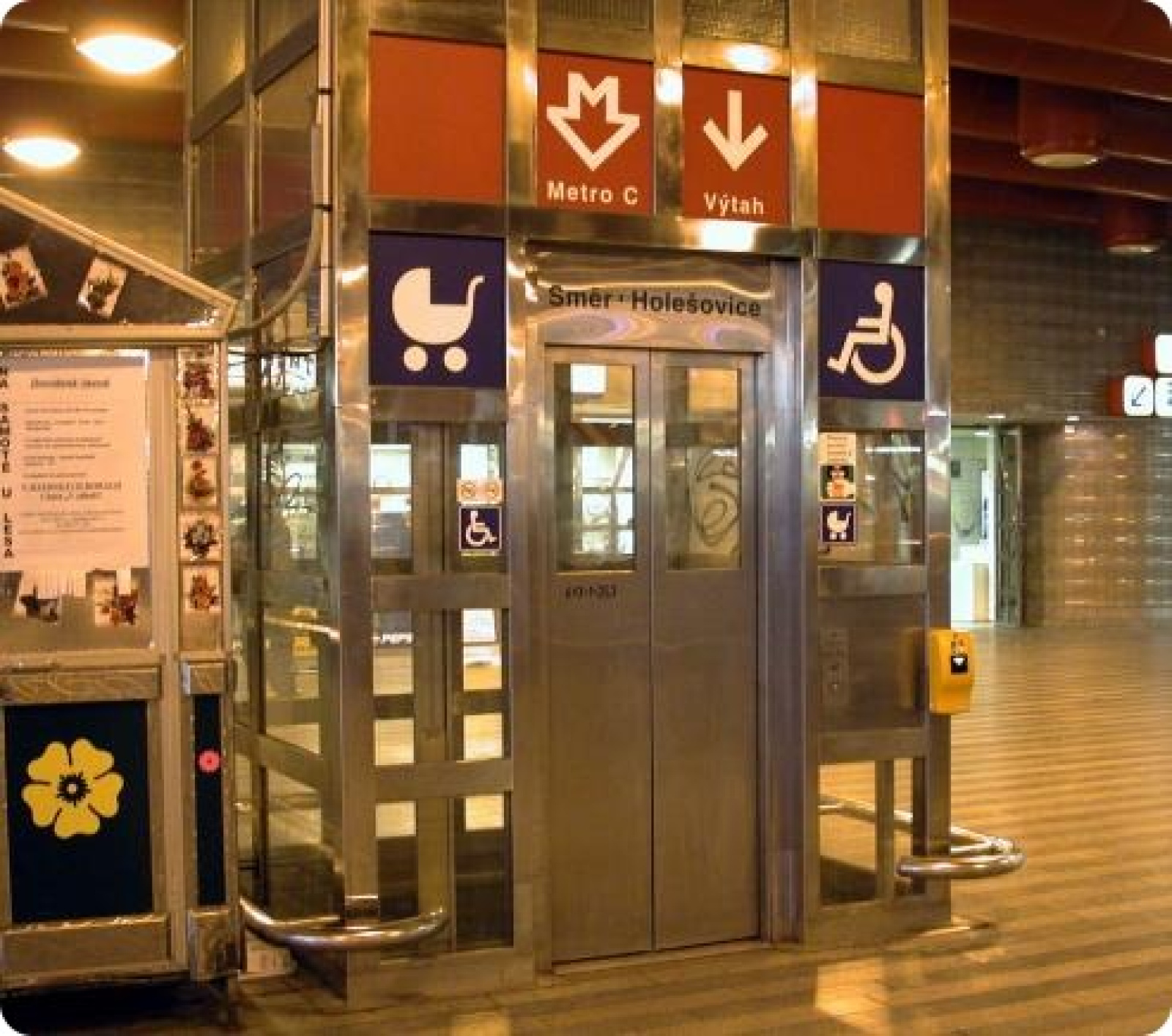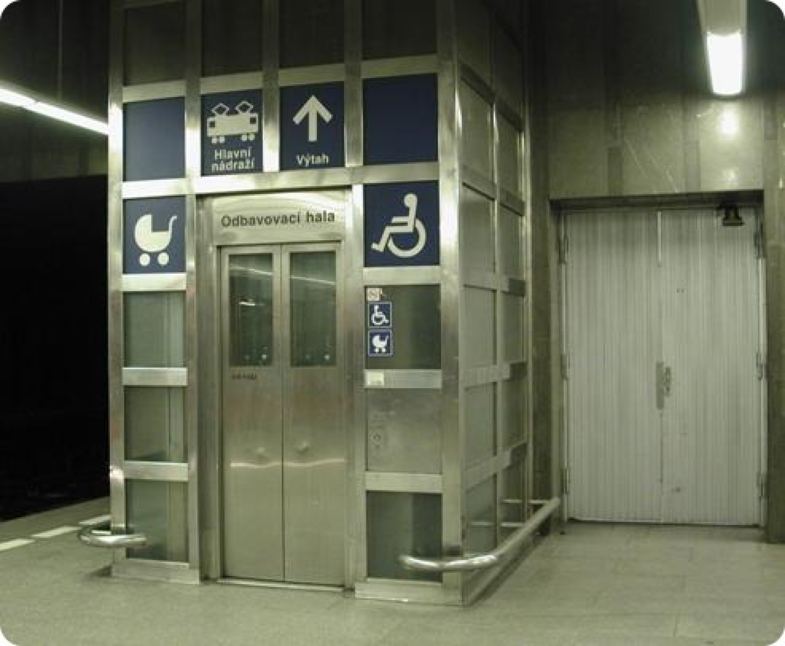 Pro bezbariérovou přepravu imobilních osob, cestujících s kočárky a osob se sníženou pohyblivostí lze použít pro každé nástupiště osobní výtah, který spojují vestibul v odbavovací hale ČD s úrovní nástupiště metra.