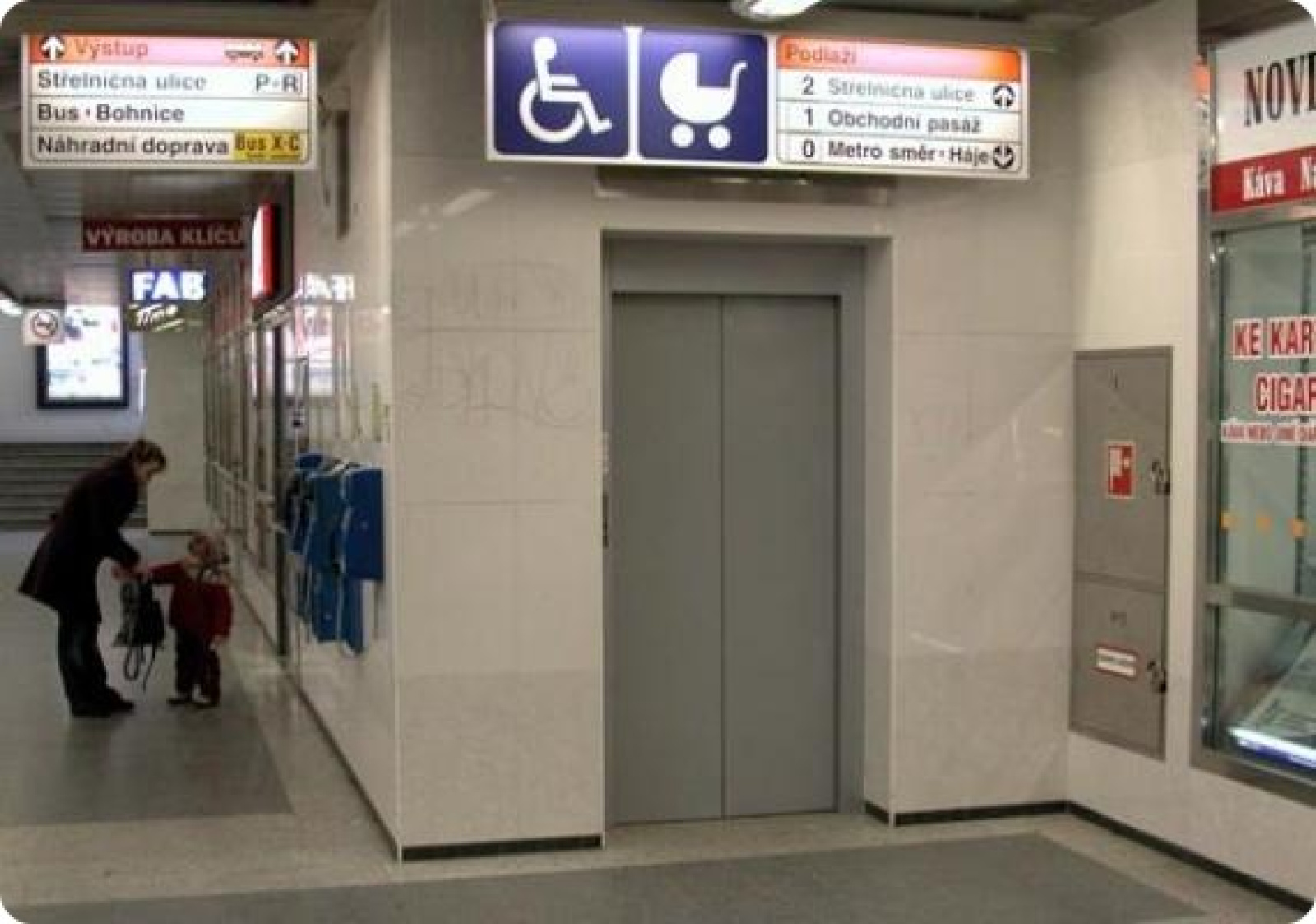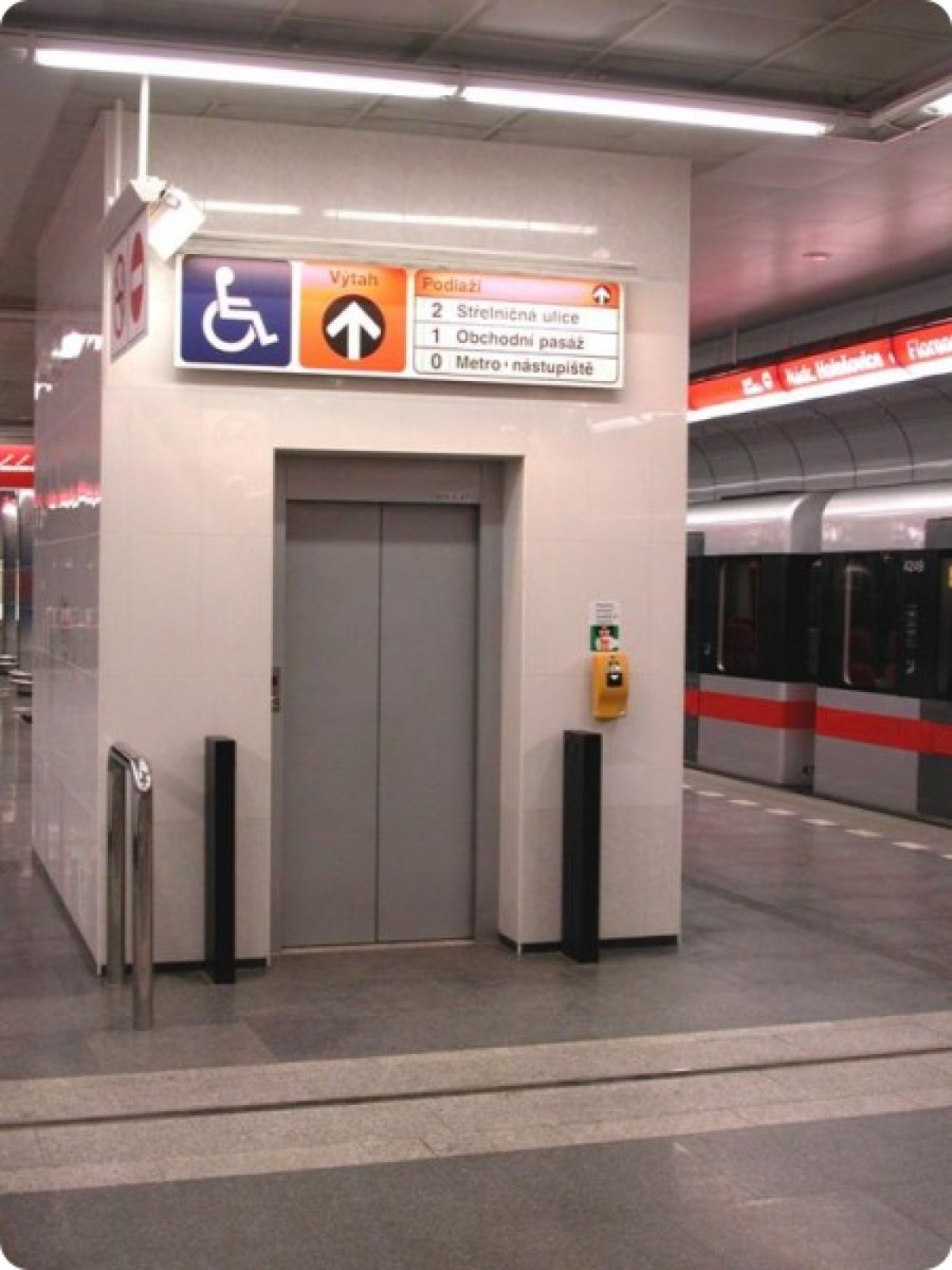 Výtah je na obou vstupech označen piktogramy a přístup k výtahu ve vestibulu a na nástupišti metra je znázorněn na informačních panelech.