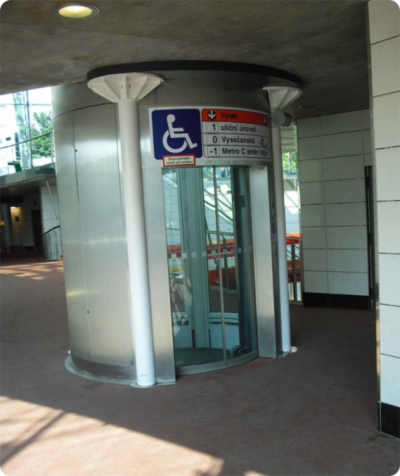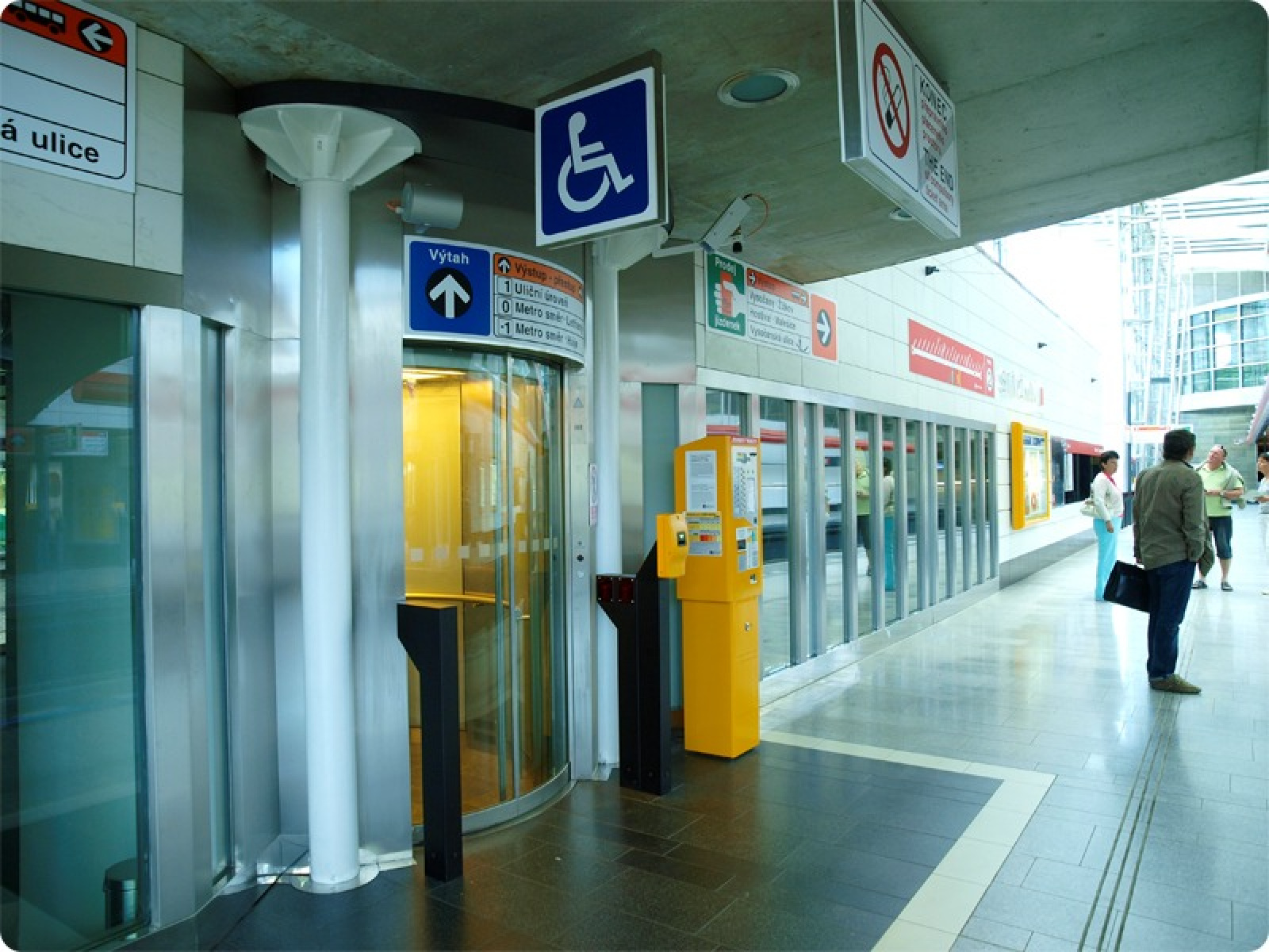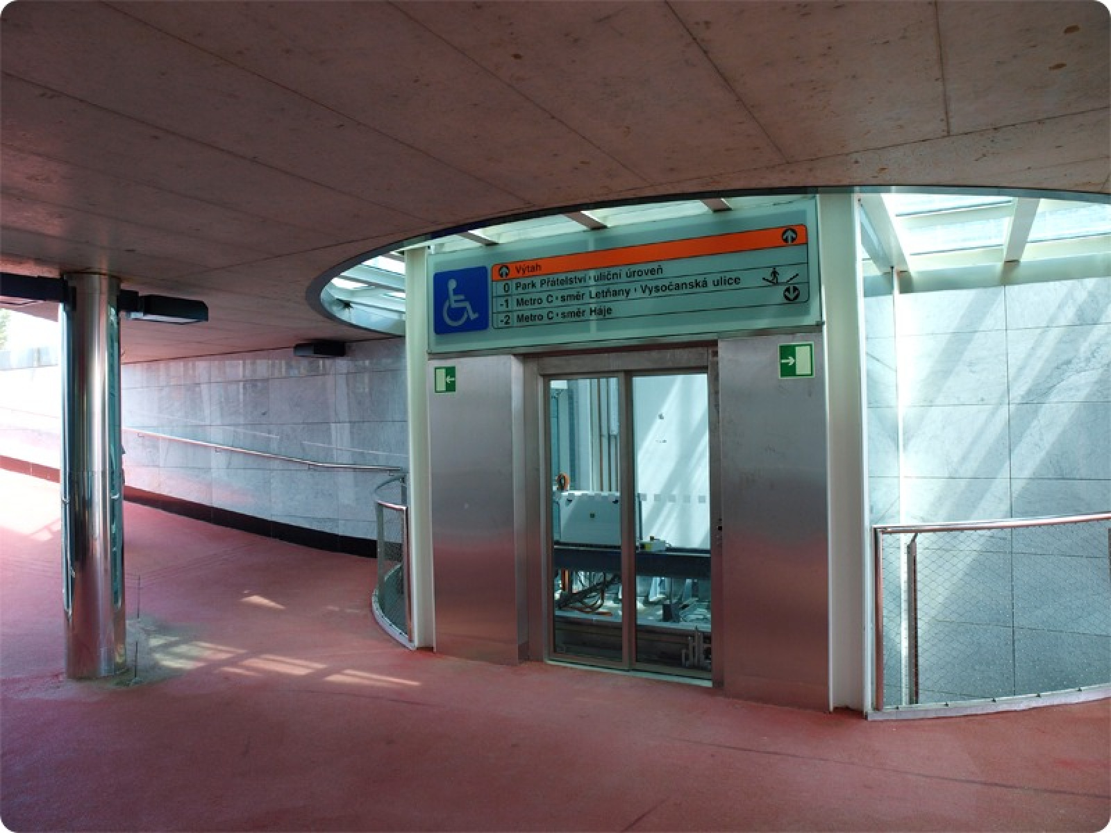 Výtahy jsou na vstupech označeny piktogramy a přístup k výtahům ve vestibulu a na nástupišti metra je znázorněn na informačních panelech.