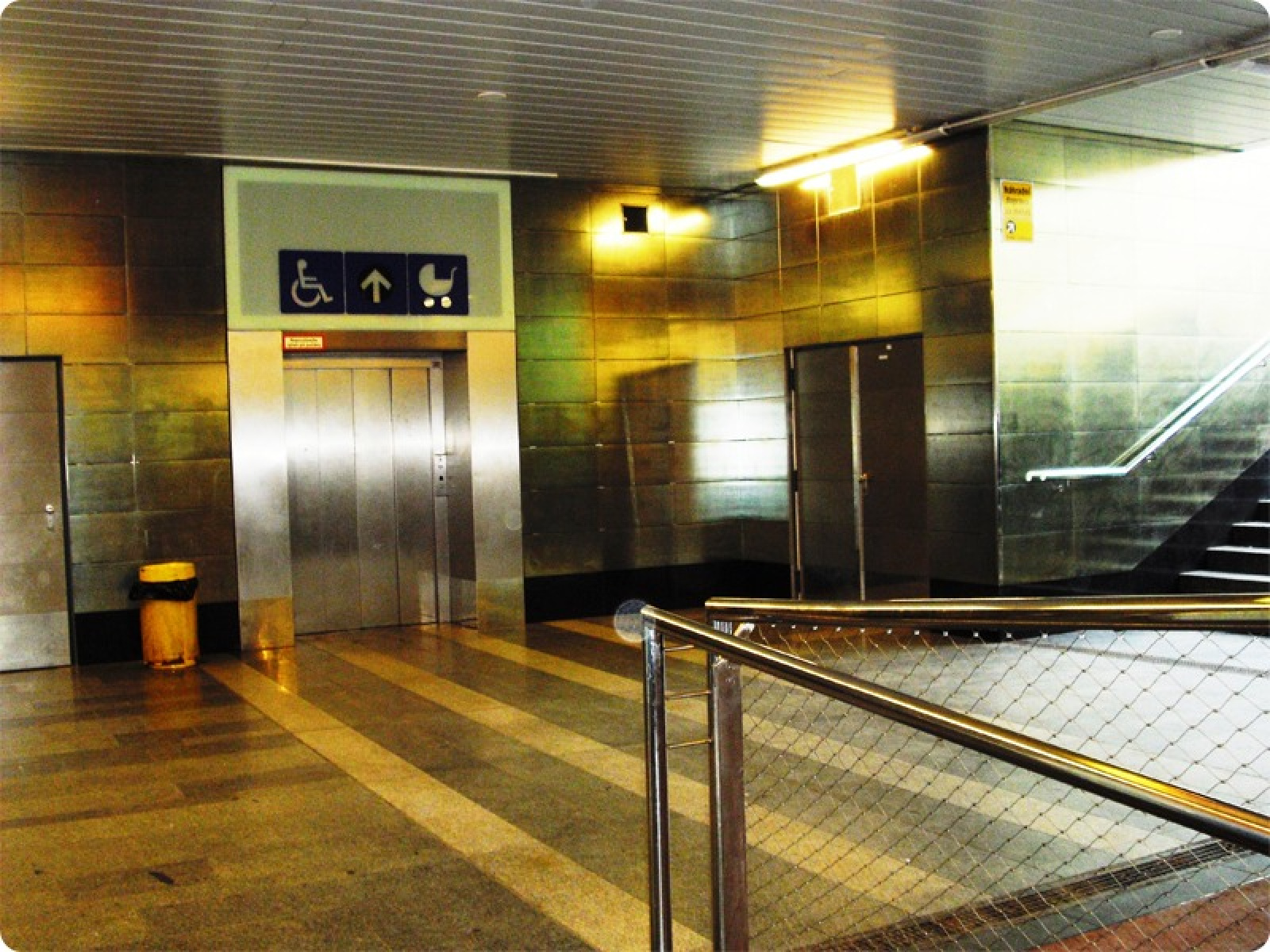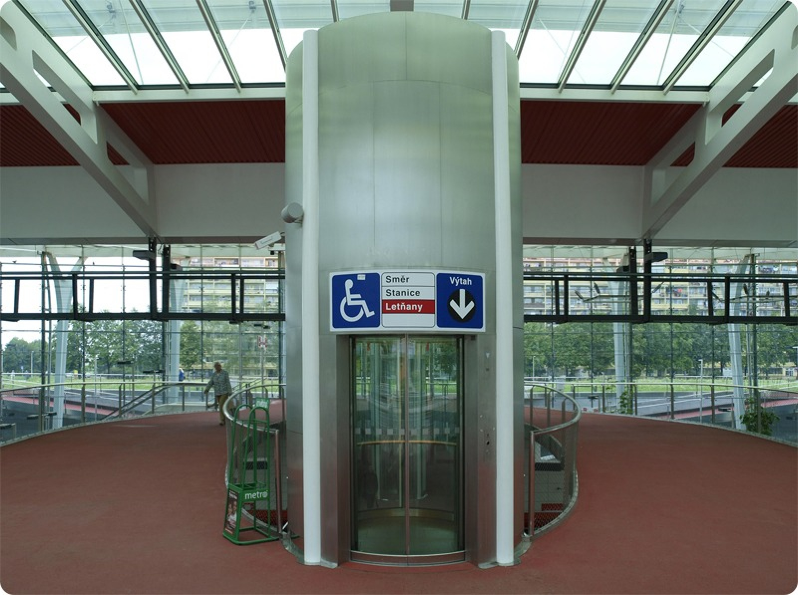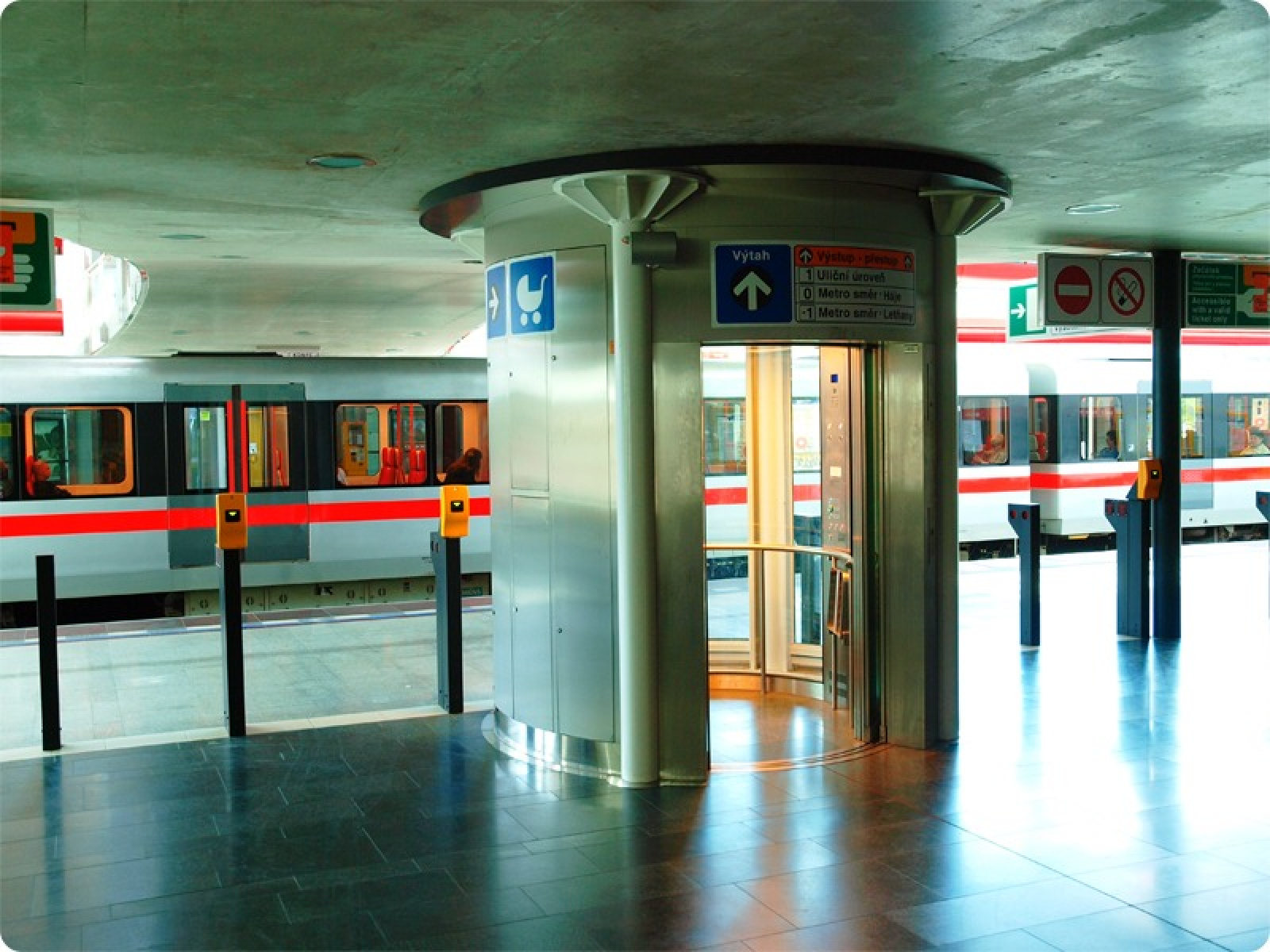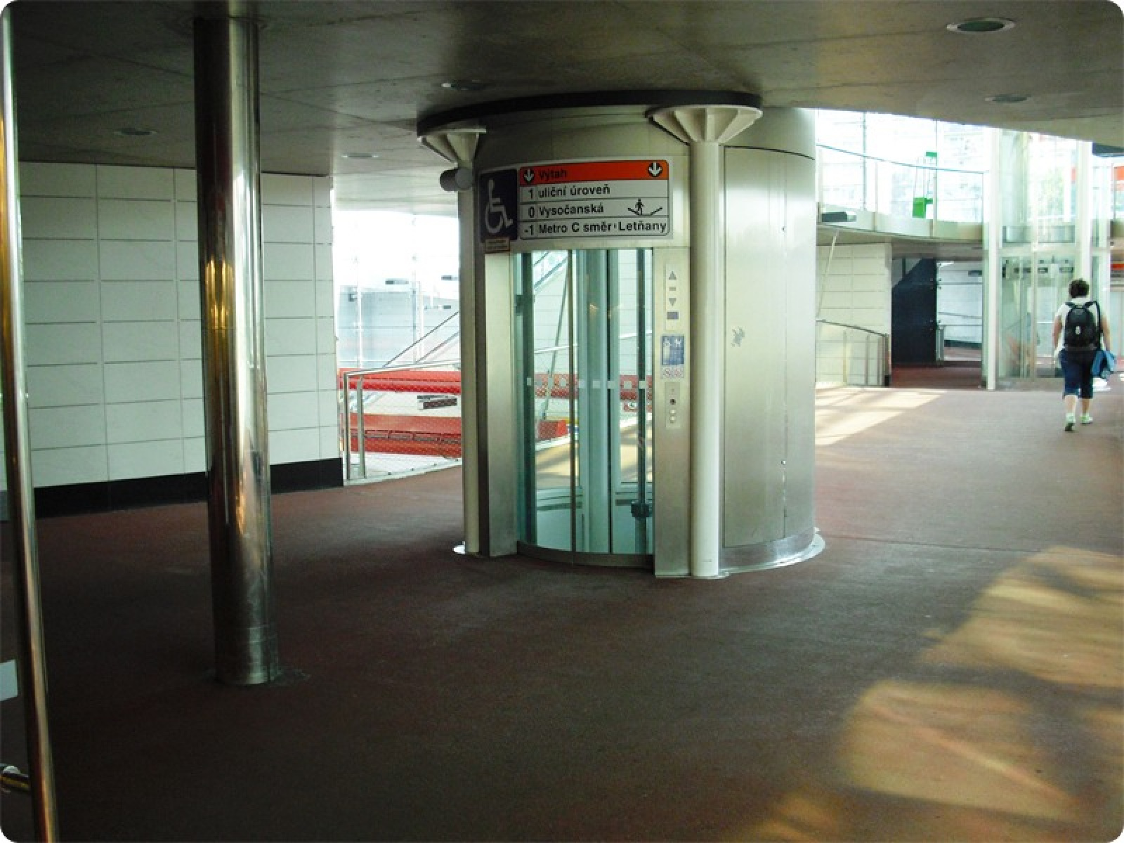 Výtahy jsou na vstupech označeny piktogramy a přístup k výtahům ve vestibulu a na nástupišti metra je znázorněn na informačních panelech.