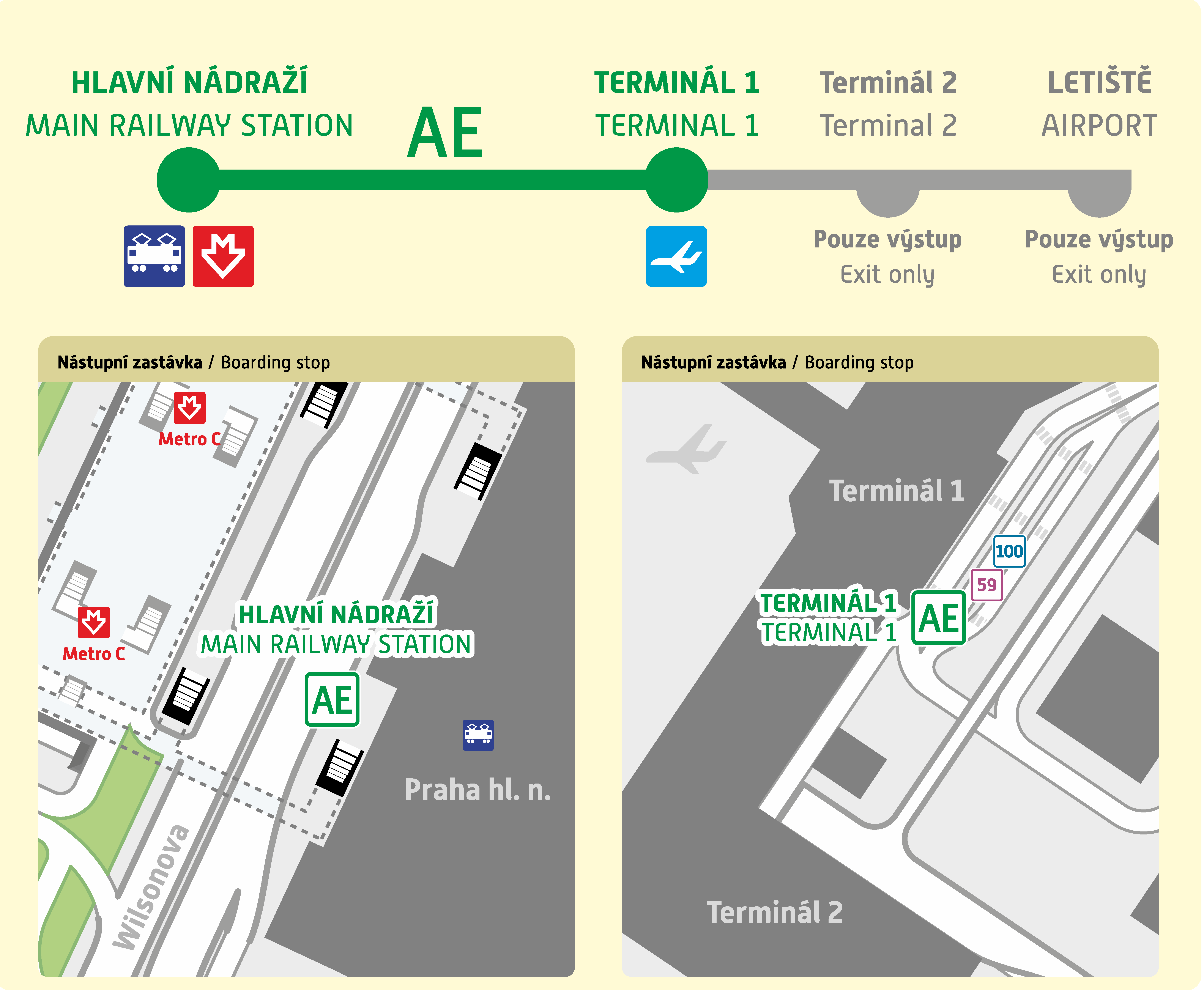 • trasa: Hlavní nádraží (C, vlak) Terminál 1 pouze výstup – Terminál 2, pouze výstup – Letiště