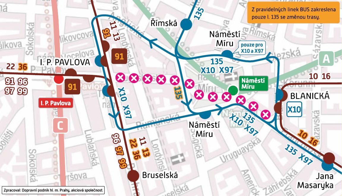 Replacement bus X10 is established in daytime operation on the route Blanická – Náměstí Míru – I. P. Pavlova.