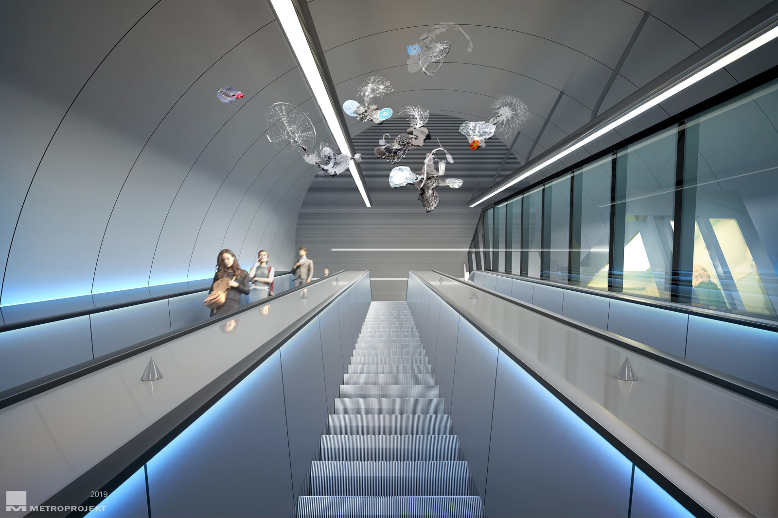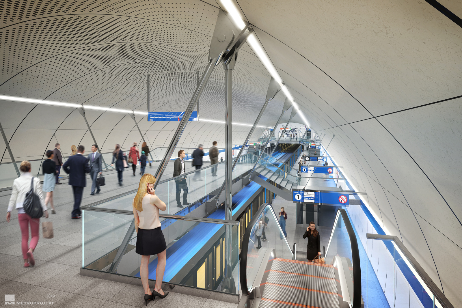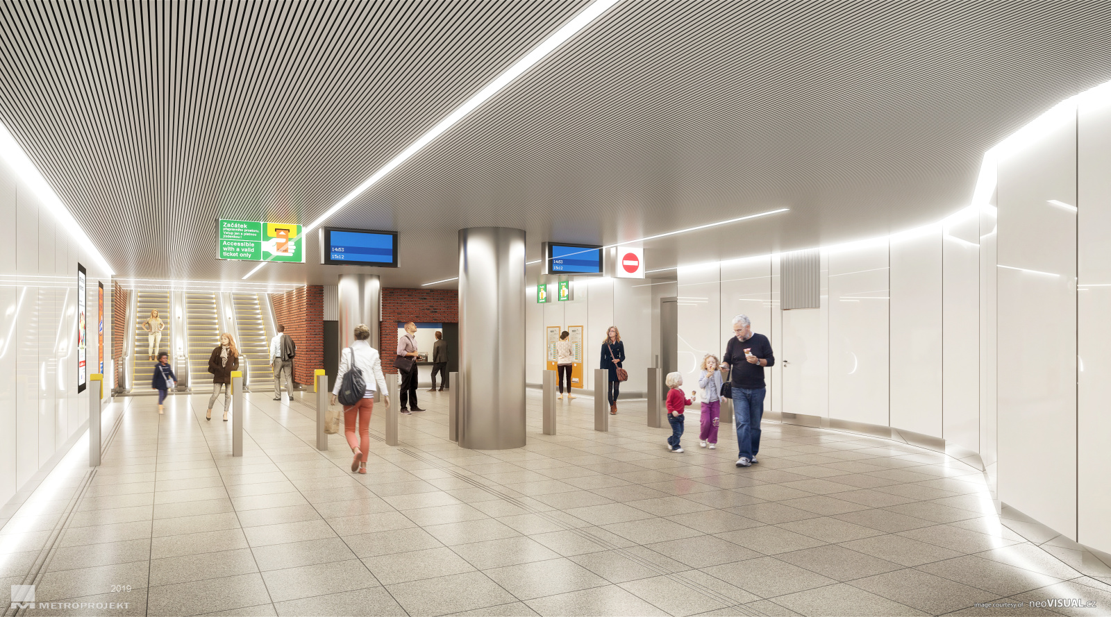 Materiálové a barevné řešení stanice, jejích vestibulů, přestupních chodeb a eskalátorových tunelů je navrženo jako střízlivé – v neutrálních barvách, s využitím palety šedých a stříbrných odstínů (povrchy kamenné dlažby, pohledových betonů, kovových obkladů soklů, akustických podhledů apod.), bílé barvy s lesklým povrchem (obklady bílým sklem) a s výrazným barevným akcentem, který představují prvky orientačního informačního systému v modré barvě, která symbolizuje samotnou barvu trasy D. Barevný koncept doplňuje navržený systém osvětlení. Základní a prostorové osvětlení bílé barvy je doplněno modrými „scénickými“ světelnými prvky (osvětlení kolejiště stanice, přisvětlení plochy klenby, přisvětlení ploch soklů, podsvětlení prvků orientačního informačního systému v přestupních chodbách a eskalátorových tunelech).