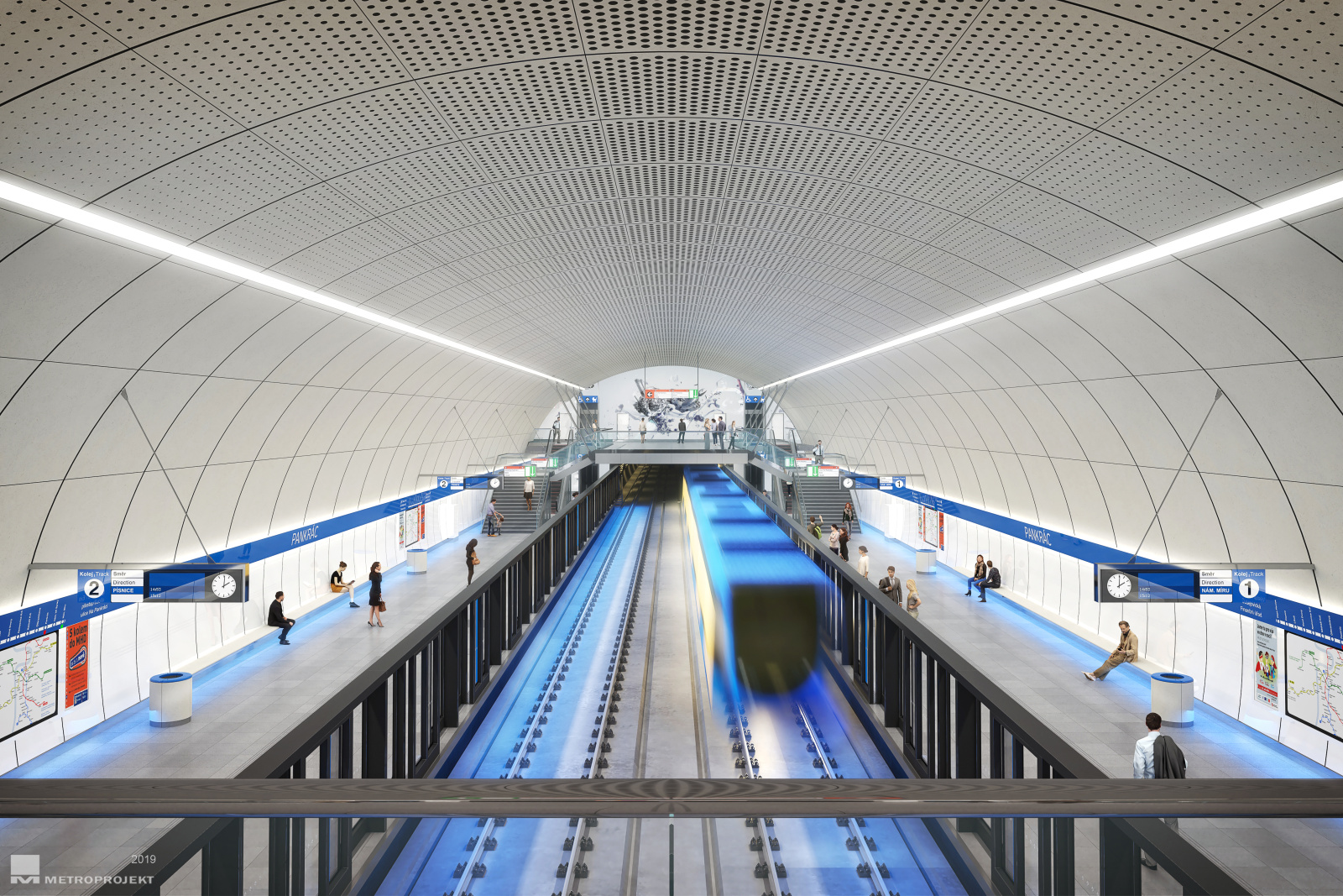 Pro obklady stěn je stanovena koncepce s použitím velkoformátových obkladů, v případě prostoru stanice v bílé barvě, která je jedním z charakteristických znaků stanice, s výraznou příčnou fragmentací (negativní spára, nuta) pro zdůraznění tvaru klenby a prostoru stanice. V projektem stanovených částech ploch umožňují obklady stěn a kleneb splnit akustické požadavky na vnitřní prostor stanice, zejména dobu dozvuku (srozumitelnost hlášení rozhlasu).