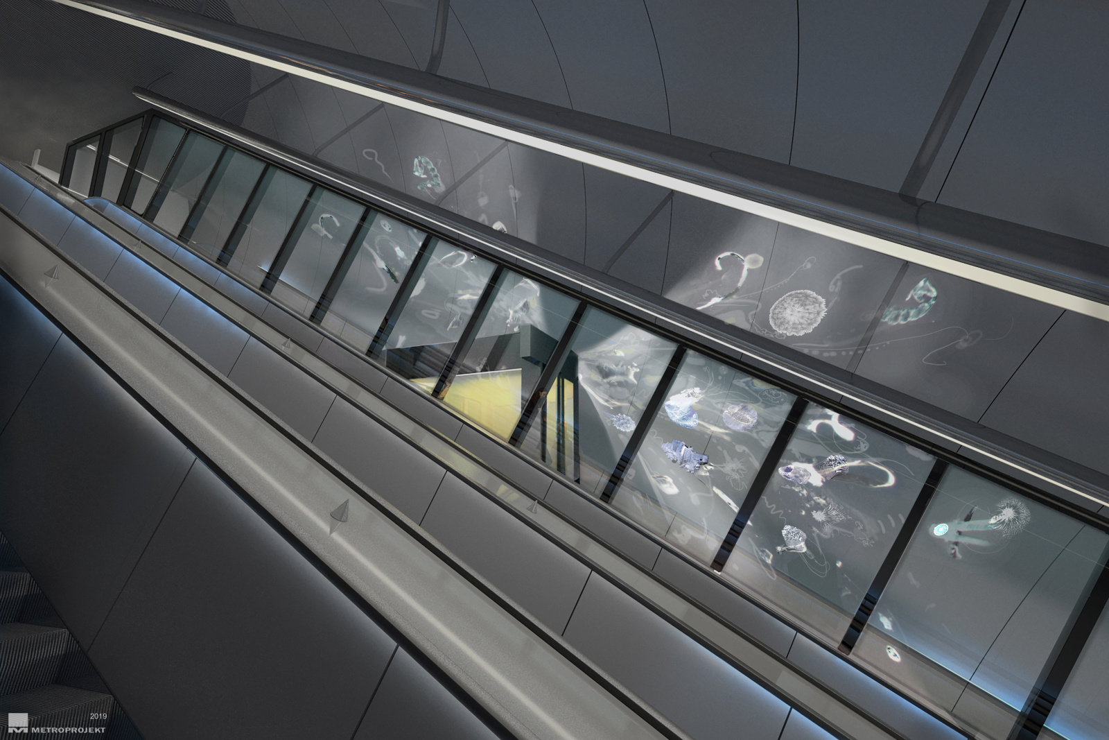 Čela stanice jsou v rámci výtvarného řešení stanice pojata jako vizuální akcent v jinak výtvarně uměřeném prostoru. Obklady stěn čel stanice tvoří mediální stěny. Na nich se mohou zobrazovat různé statické nebo pohyblivé vzory které mohou reagovat tak na různé situace (například na přítomnost soupravy ve stanici, aktuální situaci počasí na terénu apod.).