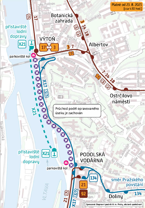 Zachována zůstává i možnost využít, v mírně pozměněném rozsahu provozu, náhradní lodní dopravu X21 v trase Výtoň – Podolská vodárna (denně od 6.30 hodin do 20.00 hodin), která má mezi cestujícími pozitivní ohlas.