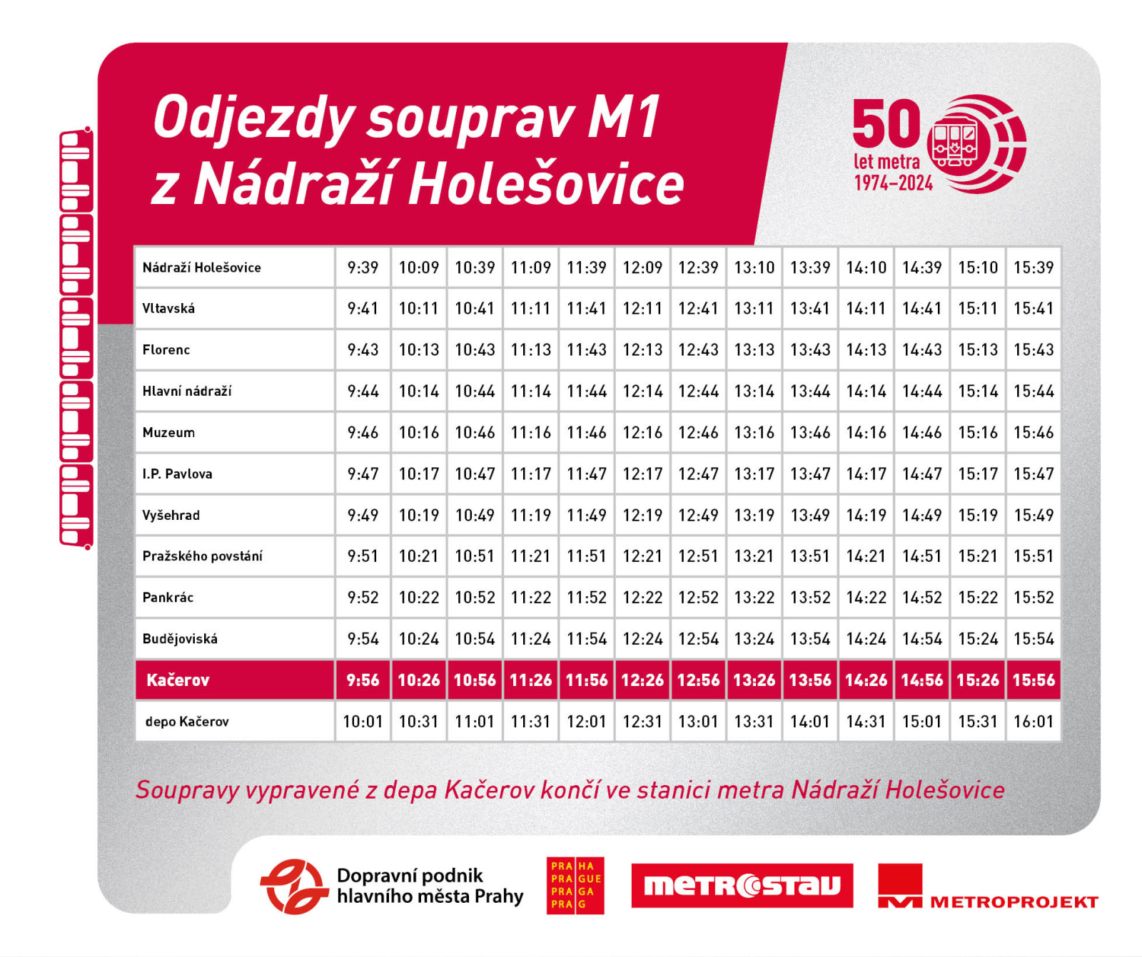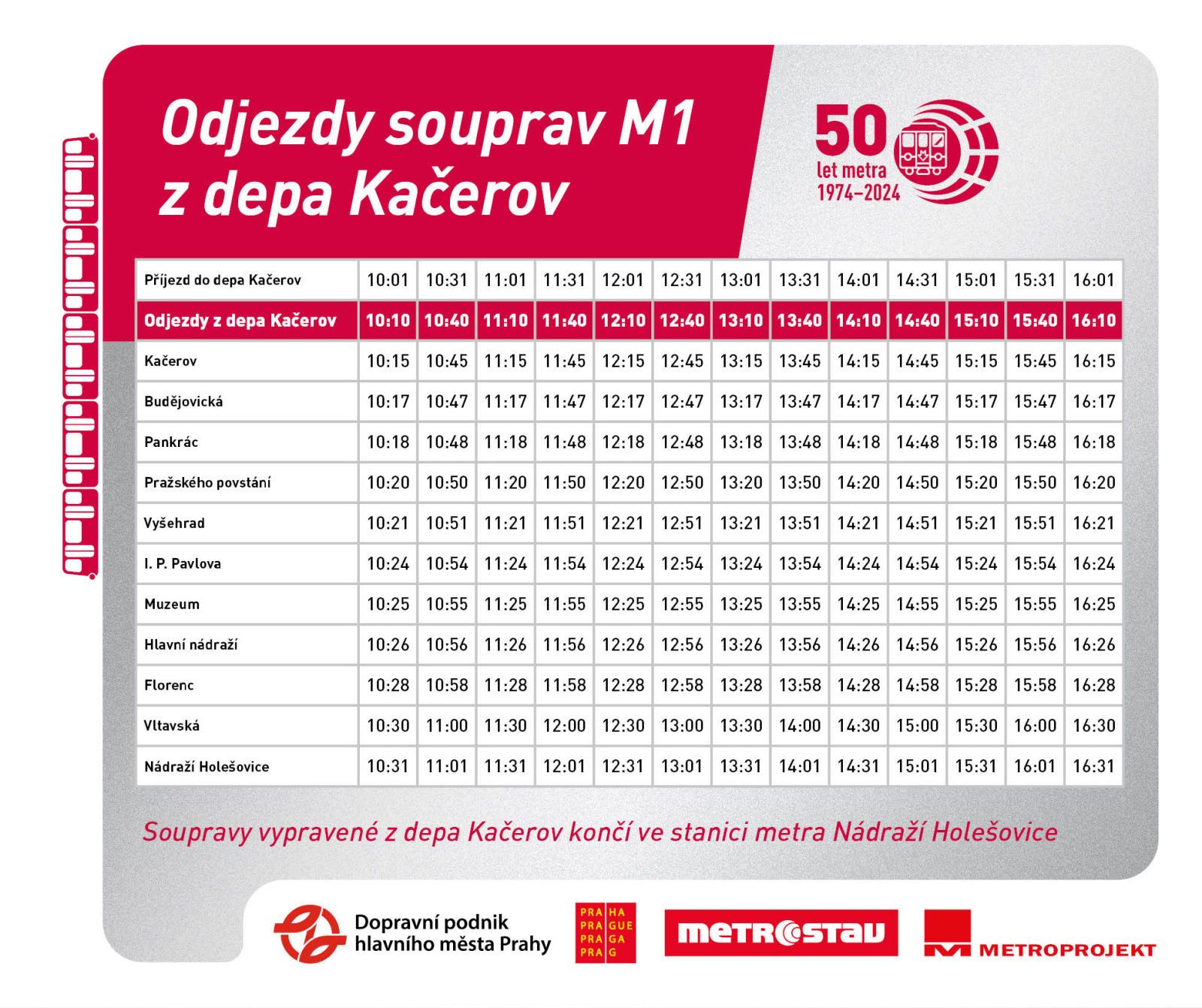 Praha, 2. května 2024 – Ve čtvrtek 9. května 2024 uplyne 50 let od slavnostního zahájení provozu první trasy metra v Praze. Dopravní podnik hl. m. Prahy (DPP) oslaví tuto historickou událost společně s Pražany a cestujícími na několika akcích. Tuto sobotu 4. května 2024 od 10 do 16 hodin pořádá DPP jubilejní Den otevřených dveří v areálu depa Kačerov. Příznivci městské hromadné dopravy se mohou těšit na prohlídku zázemí a technických prostor areálu, ukázku vozového parku a bohatý doprovodný program. Vstup na den otevřených dveří je zdarma.