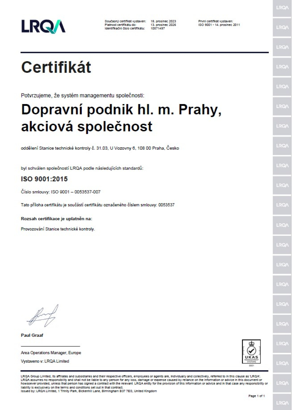 Stanice technické kontroly vlastní certifikát ISO 9001 : 2015